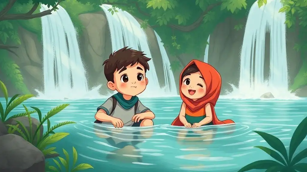 Akhirnya, setelah berjam-jam berjalan, mereka melihat sesuatu yang indah di kejauhan. Cahaya pelangi memantul dari air yang jatuh dari tebing tinggi. Mereka menemukan Air Terjun Pelangi! Airnya jernih berkilauan, dan suara gemuruhnya sangat menenangkan.