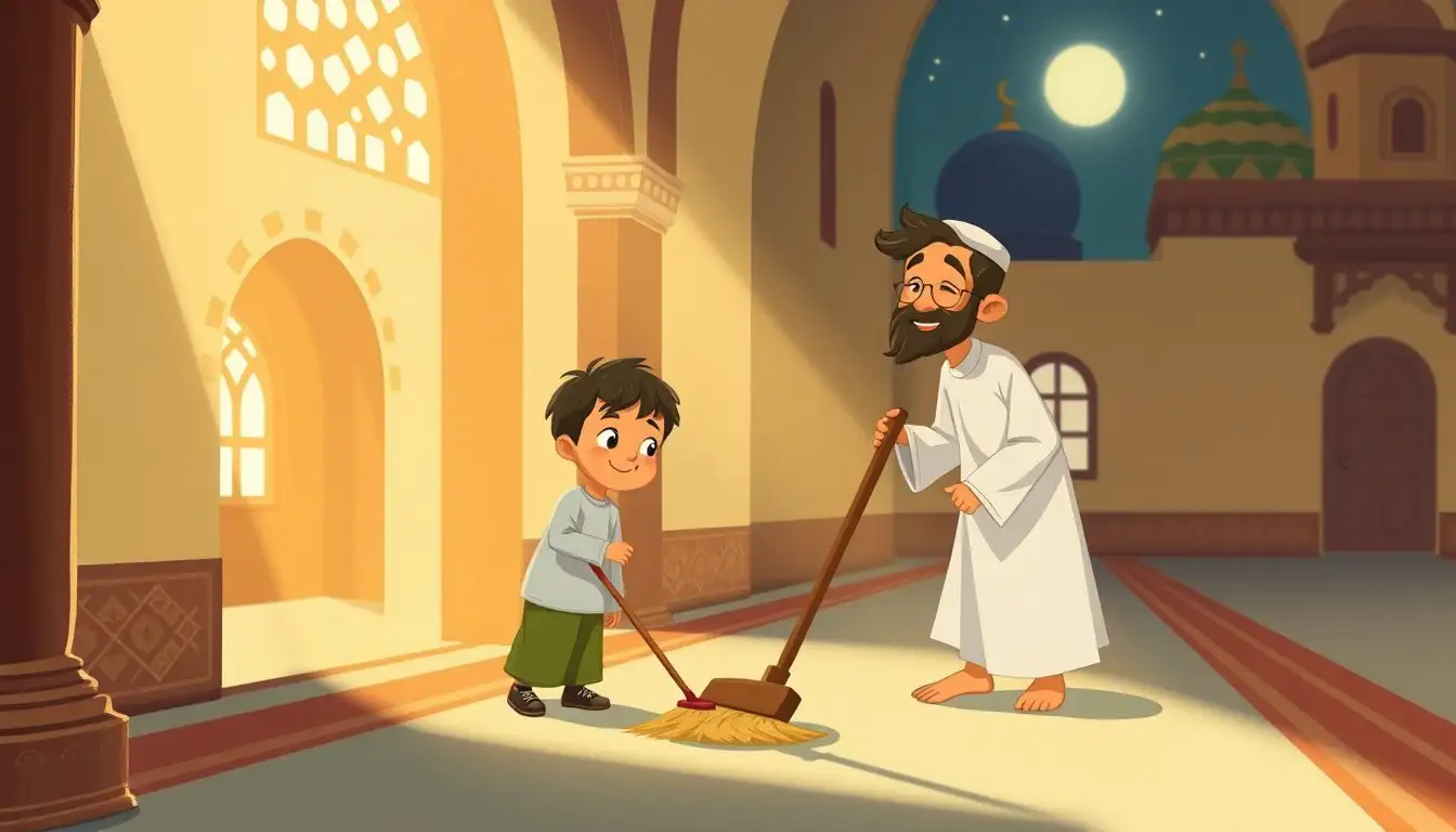 Dengan semangat baru, Bima mulai membersihkan mushola dengan teliti. Ia menyapu seluruh lantai, membersihkan sudut-sudut, dan mengusir sarang laba-laba. Ayah membantunya dengan sabar. Mereka bekerja bersama-sama, saling menyemangati.