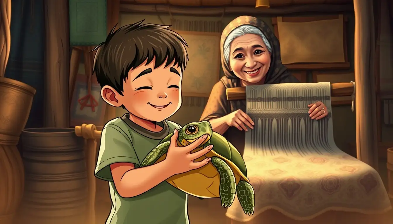 Nenek Ratih mendekat. “Bimo, Si Kura suka sekali dengan warna-warni kain batik. Ia ingin belajar menenun seperti Nenek,” kata Nenek Ratih sambil tersenyum. “Ingat, Bimo, menjaga tradisi itu penting. Kain batik adalah warisan nenek moyang kita. Kita harus menjaganya dan melestarikannya.”