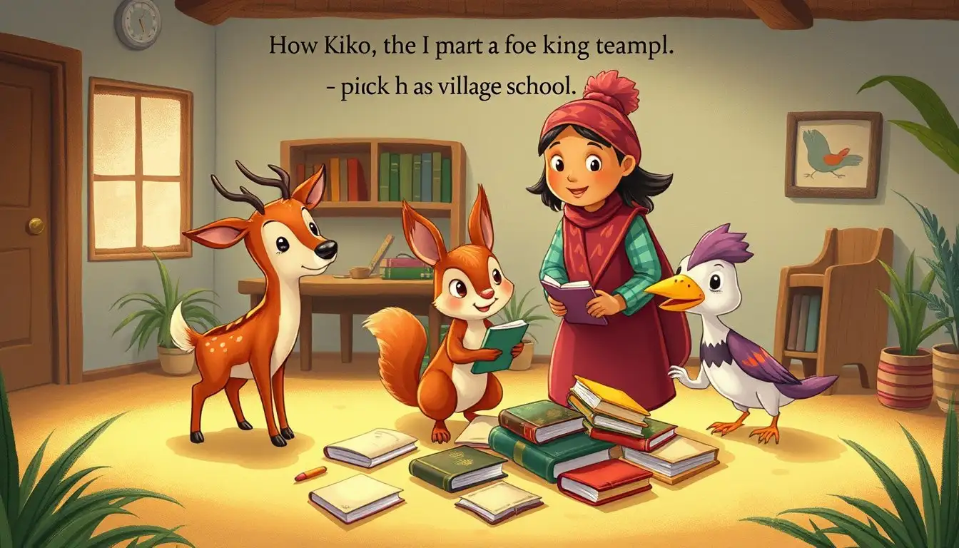 Di sebuah sekolah desa yang asri, hiduplah seekor Kancil bernama Kiko. Kiko dikenal cerdik, tapi kadang suka keras kepala. Hari itu, Bu Hani, guru yang baik hati, sedang menata tumpukan buku pinjaman untuk murid-murid. “Ayo, anak-anak, bantu Bu Hani menata buku agar rapi!” seru Bu Hani dengan senyumnya.