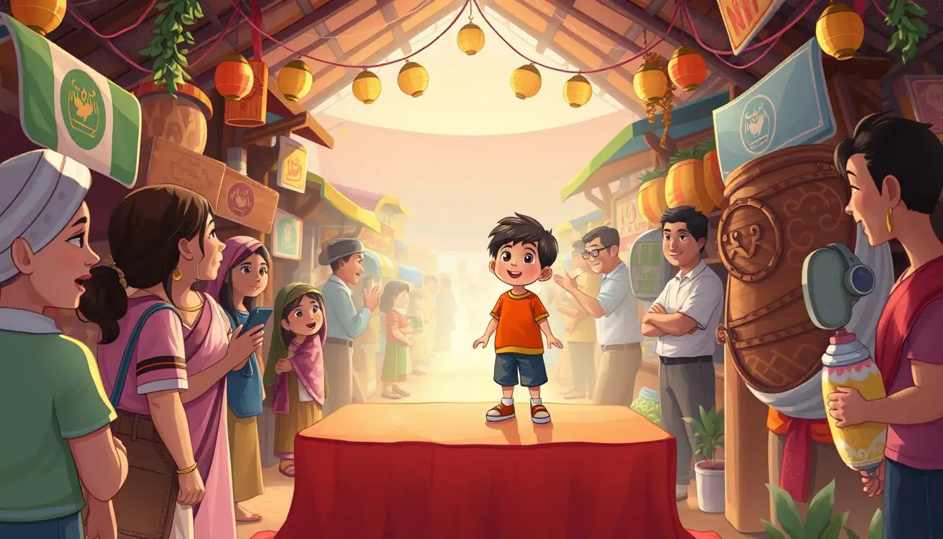 Sejak saat itu, Bima tidak lagi takut tampil di depan kelas. Ia belajar bahwa dengan keberanian dan dukungan dari orang-orang terdekat, ia bisa melakukan apa saja. Ia juga semakin rajin membantu Nenek Sri di pasar, belajar banyak hal dari para pedagang yang rukun dan saling membantu.