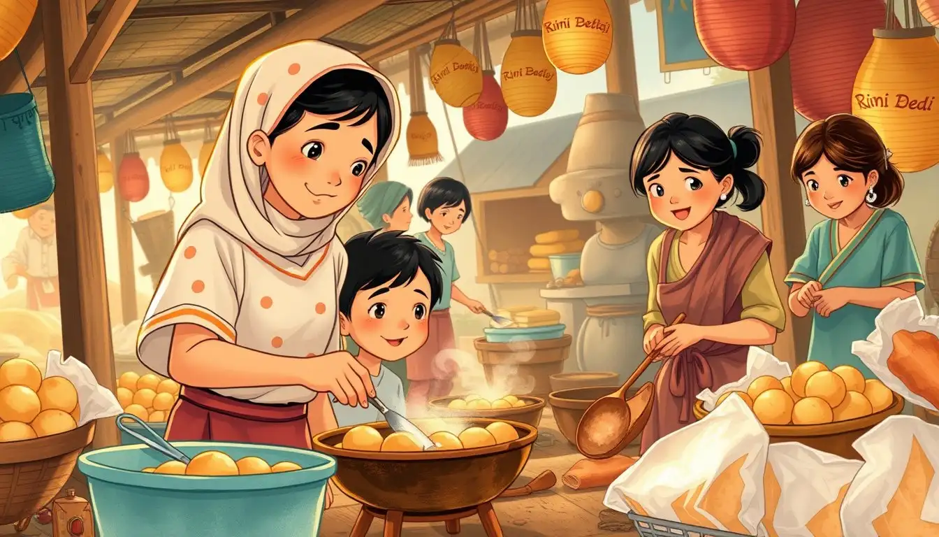 Hari pesta panen pun tiba. Pasar desa ramai sekali! Aroma kue cucur, nasi liwet, dan berbagai makanan menggoda perut. Namun, Ibu Bimo terlihat sedih. “Ibu tidak sempat membuat kue cucur cukup banyak karena Bimo belum membantu,” kata Ibu lirih.