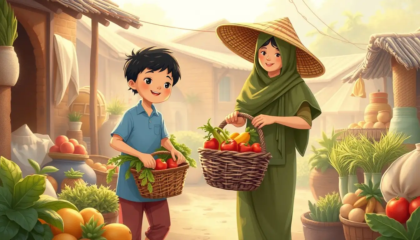 Sejak saat itu, Bima mulai sering mengobrol dengan Bu Tani dan Pak Tani. Ia belajar membantu mereka membungkus sayur dan menata dagangan. Bima menyadari, keakraban tidak harus selalu sama. Yang penting adalah saling membantu dan peduli satu sama lain.