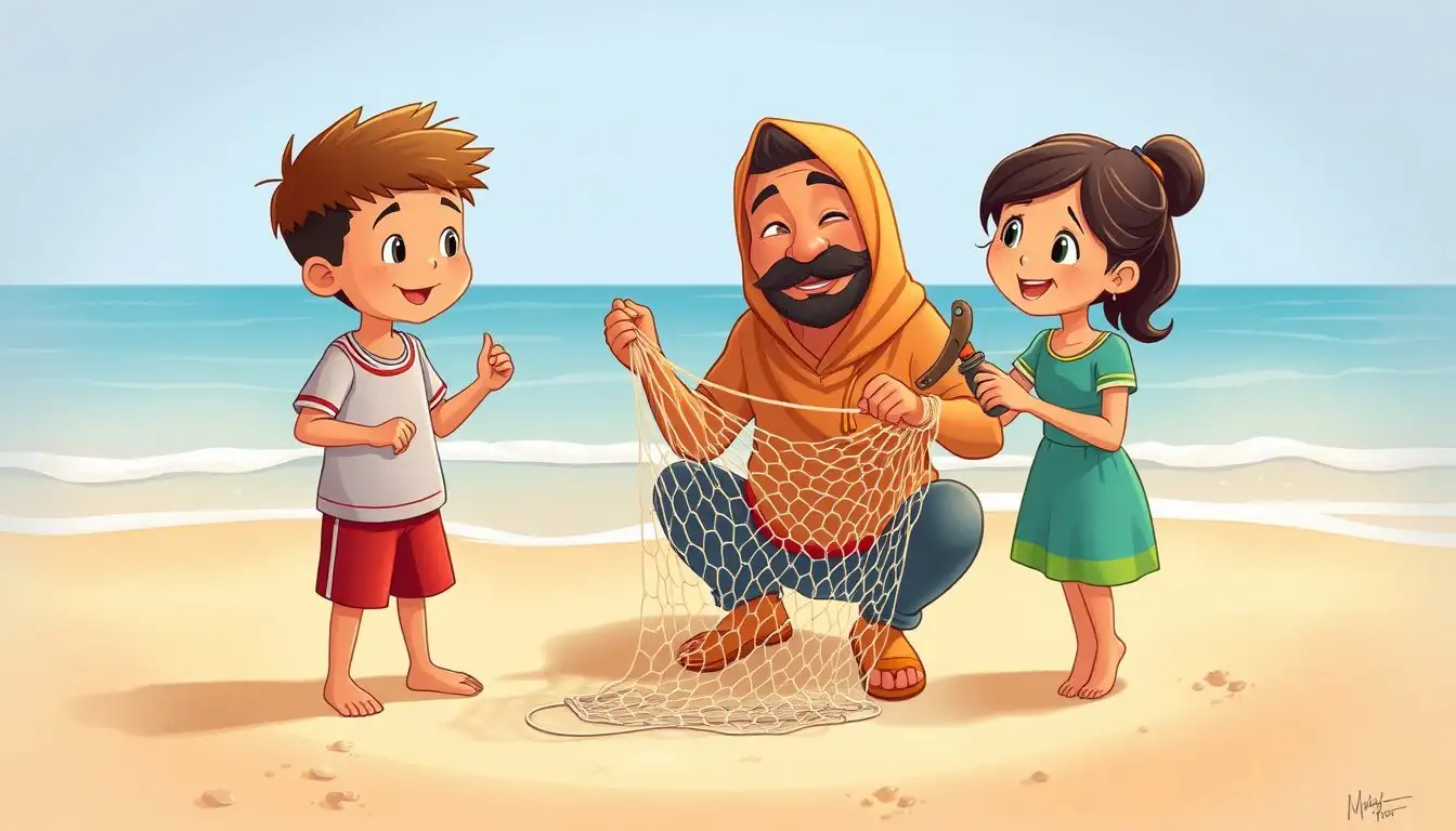 Pak Karto tersenyum. “Bagus, Bima. Mengakui kesalahan itu lebih baik daripada menyembunyikannya. Mari kita perbaiki bersama-sama.” Pak Karto mengajak Bima dan Rara untuk membantu memperbaiki jaringnya. Mereka bertiga bekerja sama dengan riang gembira. Istana pasir Bima memang belum selesai, tapi persahabatan dan rasa peduli sesama jauh lebih berharga.