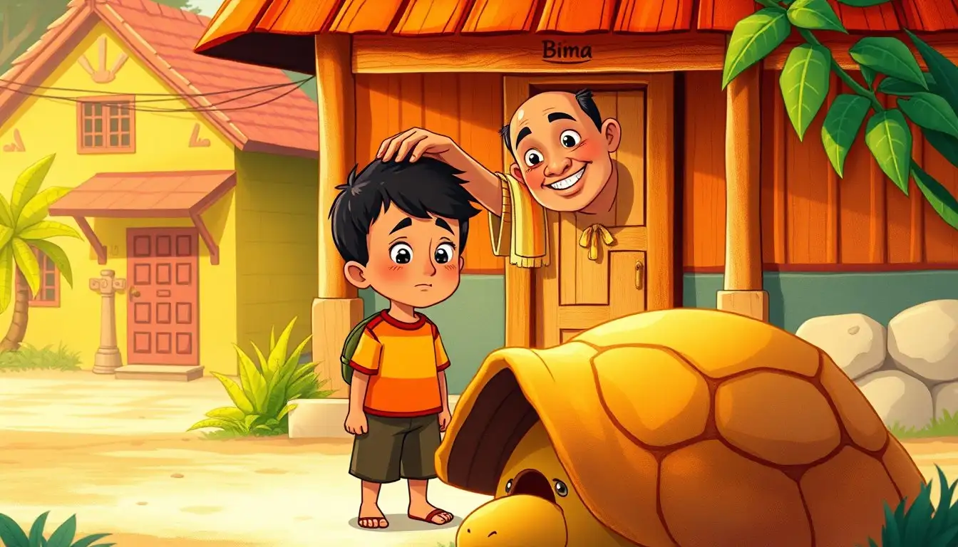 Di sebuah kampung adat yang asri, hiduplah seorang anak laki-laki bernama Bima. Bima dikenal suka bermain, tapi kadang lupa menjaga barang tetangga. Di dekat rumahnya, ada rumah Kakek Jaya, seorang pembuat wayang yang baik hati. Di depan rumah Kakek Jaya, ada sebuah rumah kura-kura kecil yang menjadi tempat tinggal berbagai macam alat wayang.
