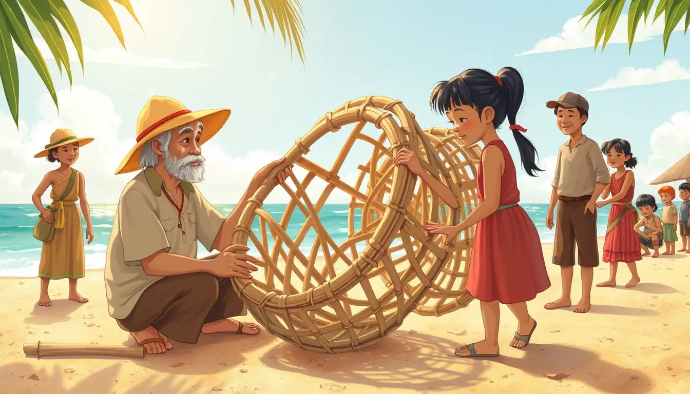 Mentari pagi menyapa Pantai Tanjung Biru dengan hangat. Pak Tani, seorang petani yang ramah, datang membawa anyaman bambu yang sudah mulai lapuk. Ia ingin memperbaiki keranjang besar yang digunakan untuk menangkap ikan bersama warga desa.