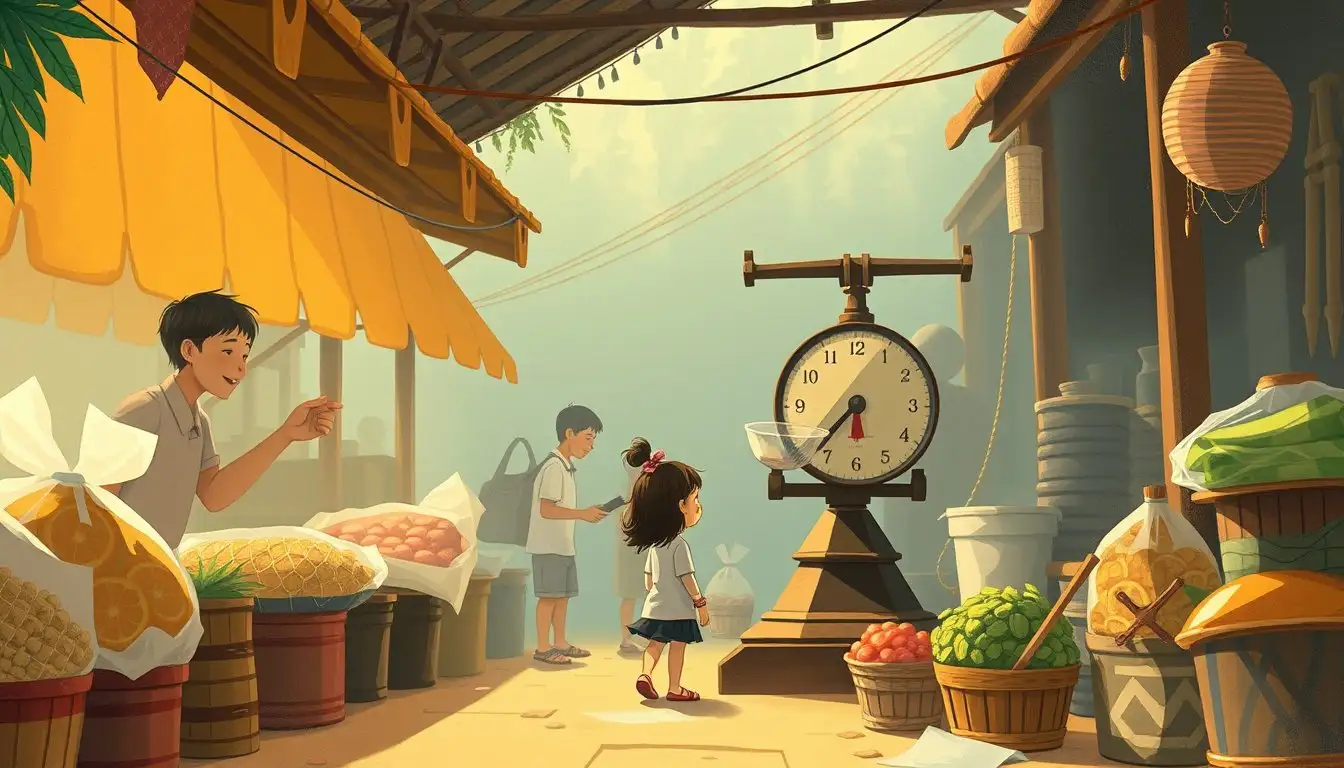 Suatu hari, ada seorang pedagang baru yang datang ke pasar. Namanya Pak Budi, dan ia menjual buah-buahan segar. Pak Budi memiliki timbangan besar yang sangat bagus. Semua pedagang ingin menggunakan timbangan Pak Budi untuk menimbang barang dagangan mereka.