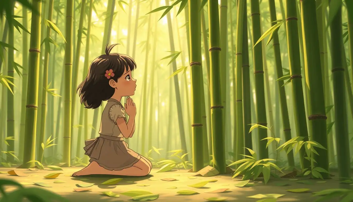Di sebuah hutan bambu yang rindang, hiduplah seorang gadis kecil bernama Lala. Hutan bambu itu sangat istimewa, bambu-bambunya tumbuh subur dan memberikan kesejukan bagi seluruh desa. Lala sangat menyayangi hutan bambu itu, karena di sanalah ia sering bermain dan mencari bunga-bunga cantik.